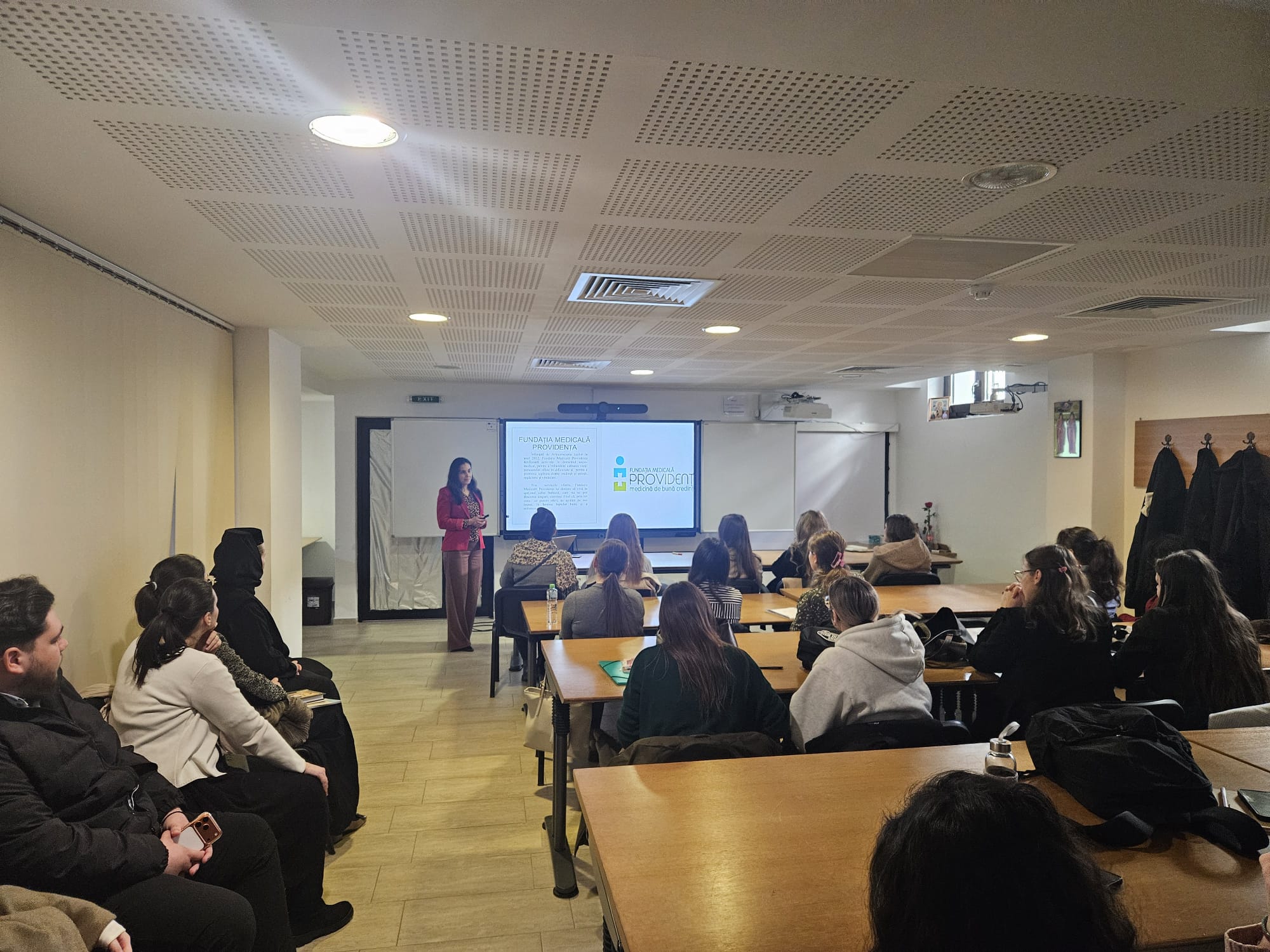 În cadrul prezentării, invitata a împărtășit din experiența activității sale profesionale, detaliind atribuțiile specifice ale asistentului social în cadrul clinicii, etapele elaborării și implementării planului de intervenție pentru pacienții și familiile aflate în situații de vulnerabilitate, precum și inițiativele comunitare dezvoltate de Policlinica Providența, printre care și caravanele medicale menite să faciliteze accesul la servicii și sprijin pentru persoanele din medii izolate sau defavorizate.